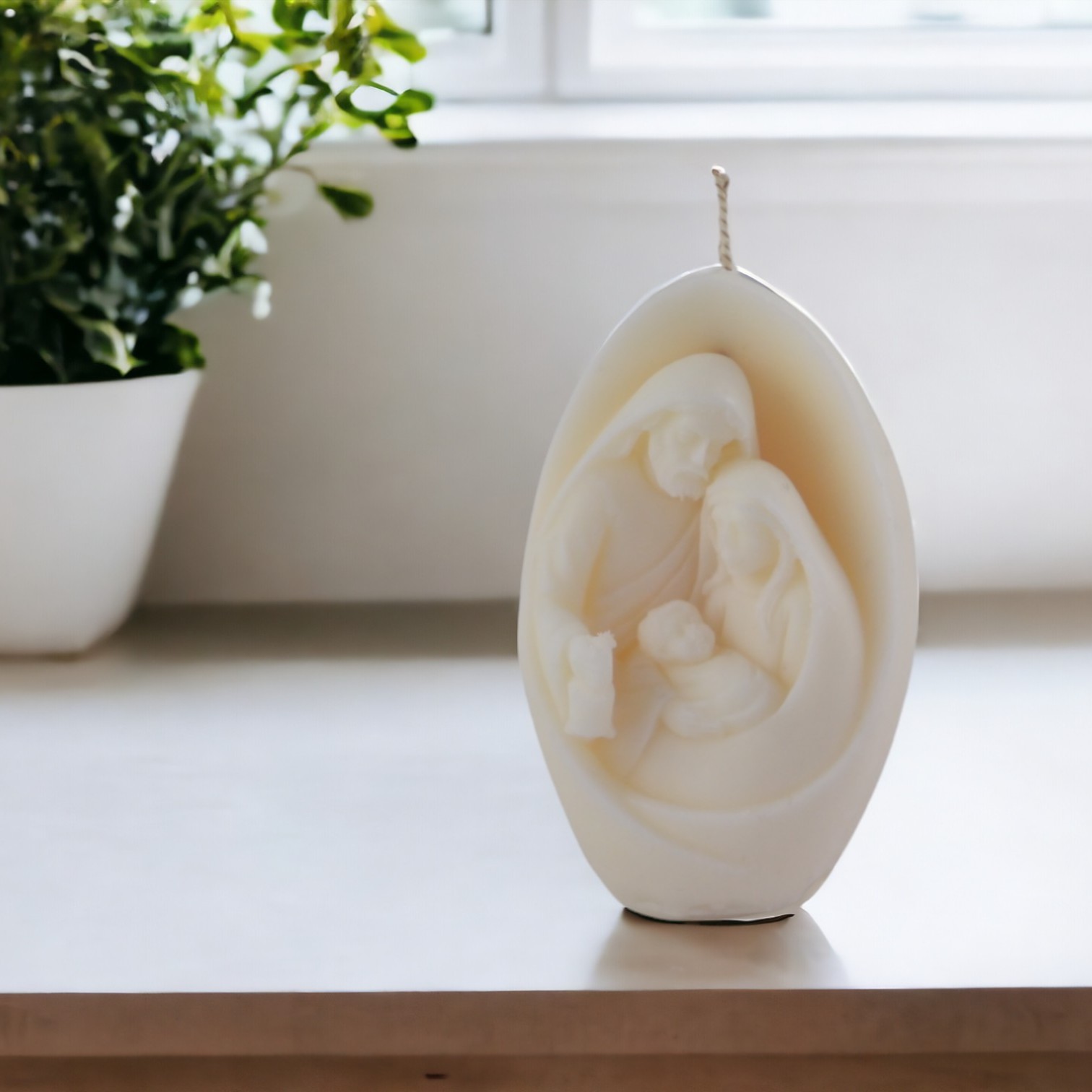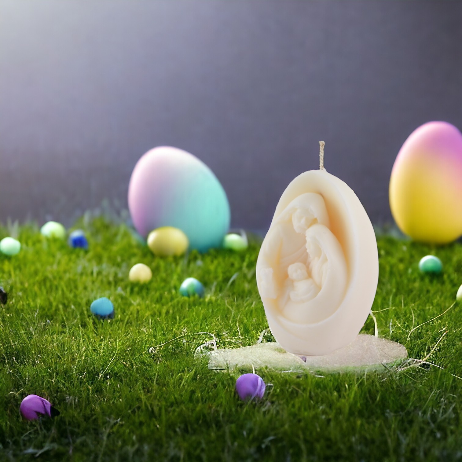 Lumanare decorativa parfumata Ou de Paste Sfanta Familie, alb