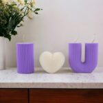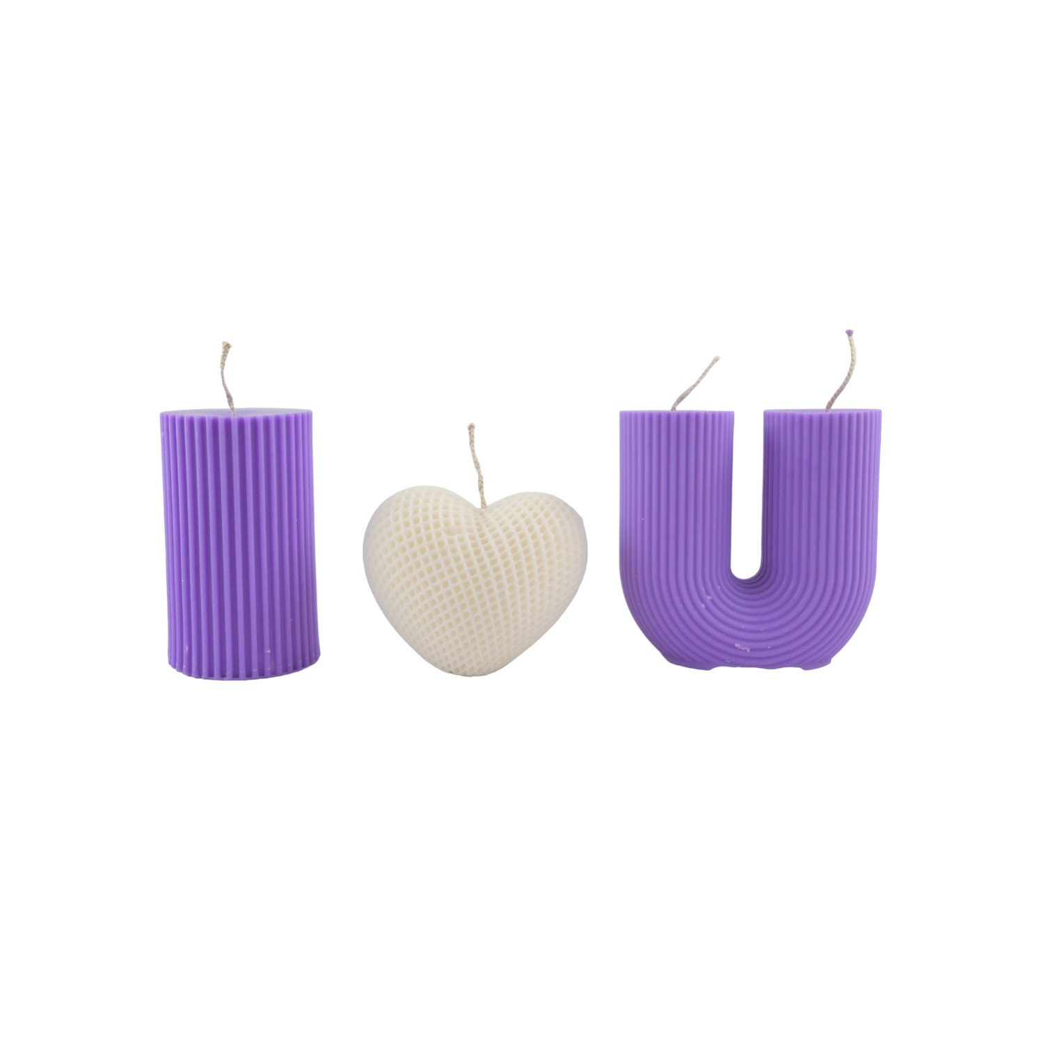Set de 3 lumanari parfumate care, impreuna, formeaza fraza „I Love you”.